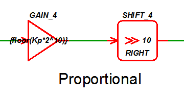For more detail, we will examine the Proportial leg of the PID compensator. The calculated ???MATH???K_p???MATH??? value in this example is 0.173585978182213. From here, we have to determine how "large" of a number we need to mutiply ???MATH???K_p???MATH??? by in order to lessen the amount of error that is introduced when converting to an integer. You also want to multiply by a number that is equal to ???MATH???2^n???MATH??? so that you can use the Right Shift SystemDesigner component. A Right Shift is the same as dividing by ???MATH???2^n???MATH???, where ???MATH???n???MATH??? is the number of bits. In this example, we chose ???MATH???n=10???MATH???: