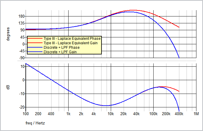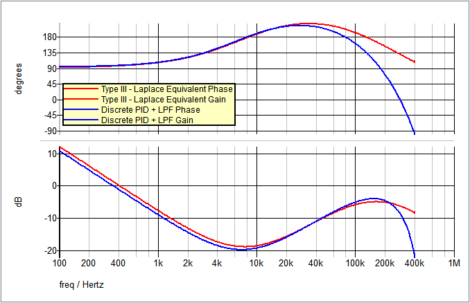 The AC results of the Type III Laplace Filter equivalent (from Step 1) and the new discrete time filter compensation are compared here: