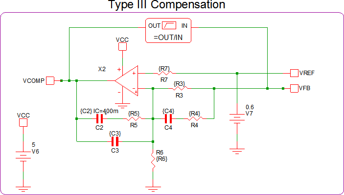 Now that you have an equivalent laplace based compensation network, you can replace your existing Type III compensator. The Type III - Laplace Filter equivalent circuit will remain in the circuit for later comparison.