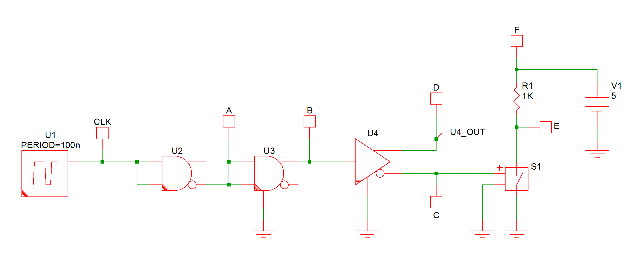 The following circuit example is intended to help you better understand the difference between an analog node and a digital node. Nodes CLK, A, B, and D are all considered digital nodes. Nodes C, E, and F are considered analog nodes. The fact that the AND gate U3 has a ground reference does not imply its input and output pins are connected to analog nodes. It only means that it is acceptable for its pins to touch analog components. Since there are no analog components connected to nodes A and B, these two nodes are considered digital nodes. Node C is an analog node since it is connected to a voltage-controlled switch, which is an analog component. Node D is connected to one digital device, U4, and a voltage probe, and no analog components. Hence, node D is considered a digital node. Nodes E and F are analog nodes since they do not touch any digital devices at all.
