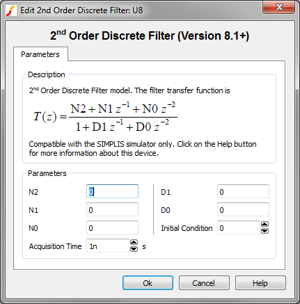 The information in this topic refers to the latest 2nd Order Discrete Time Filter which was introduced in version 8.10. In versions prior to 8.10, a similar Discrete Time Filter exists and has the same behavior as the new version. The new version simulates slightly faster than the old version, but the electrical behavior is identical. If you require a discrete time filter for use in versions prior to 8.10, the old 2nd Order Discrete Time Filter can be placed from the part selector location: .
