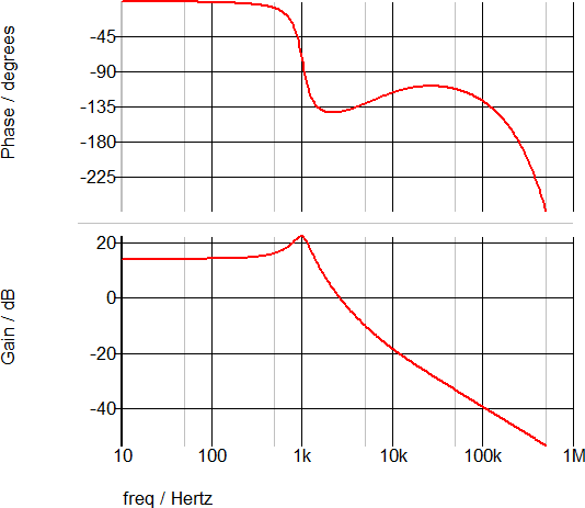 The following AC waveforms confirm that the DC gain is 13.98dB and the pole is approximately 1kHz.