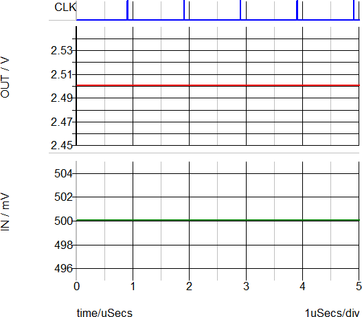 The POP waveforms below show that the DC input voltage to the filter is 0.5V and the DC output voltage is 2.5V, confirming that the DC gain of the 2nd order discrete time filter is 5.