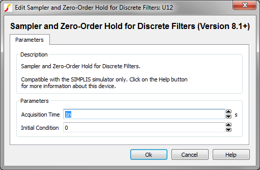 The Sampler and Zero-Order Hold models an analog sample and hold. On each clock edge, the input voltage is sampled and held until the next clock edge. As with the other devices in the Discrete Time Filter category, the Sampler and Zero-Order Hold is compatible with the SIMPLIS POP and AC analyses.