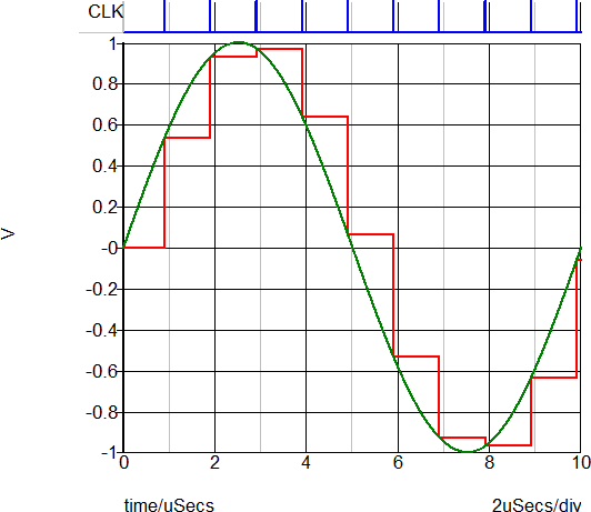 In the circuit example, a 100kHz sine wave with a 1V amplitude ( +/- 1V peak ) is applied to the input of the sampler and hold. The clock has a frequency of 1MHz, and the sampled input voltage is output on the same graph as the input voltage.