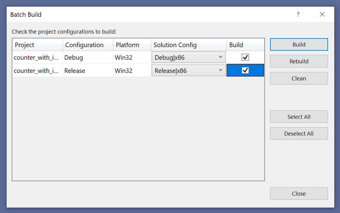 From the menu, choose Build | Batch Build... and select both the "Debug" and "Release" versions to build.