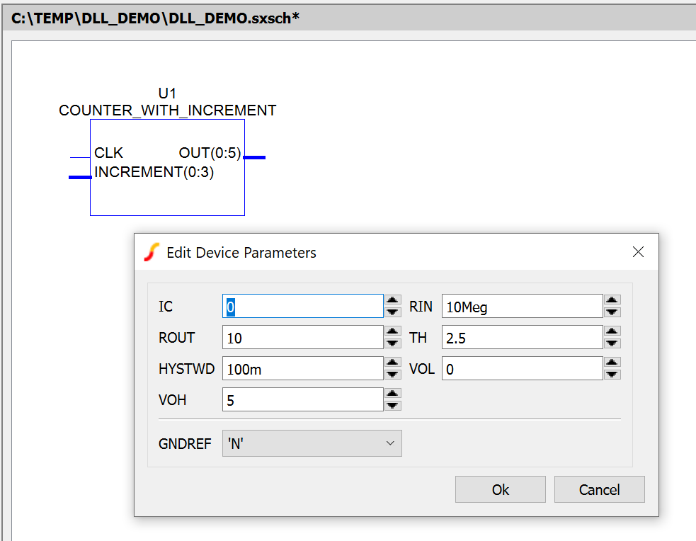 At this point, the system loads the DLL file and gets a list of the devices that are defined in it. Since this example only has one device definition, that definition is automatically selected and a symbol is created for it. Place it on the schematic.