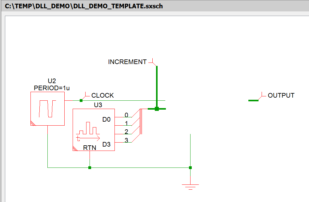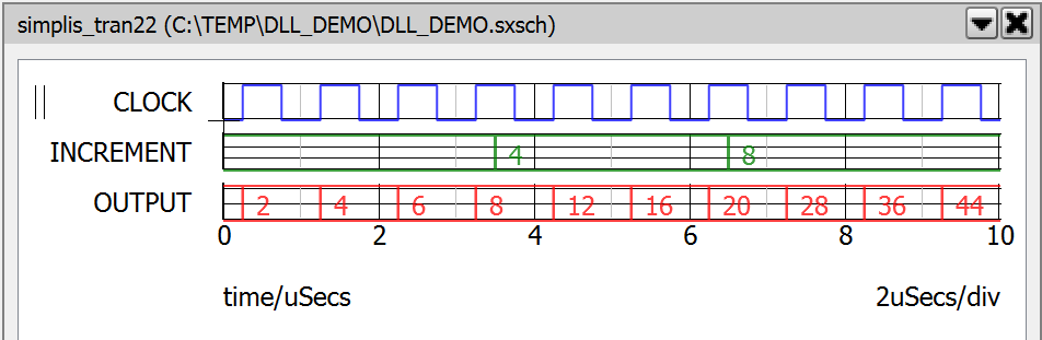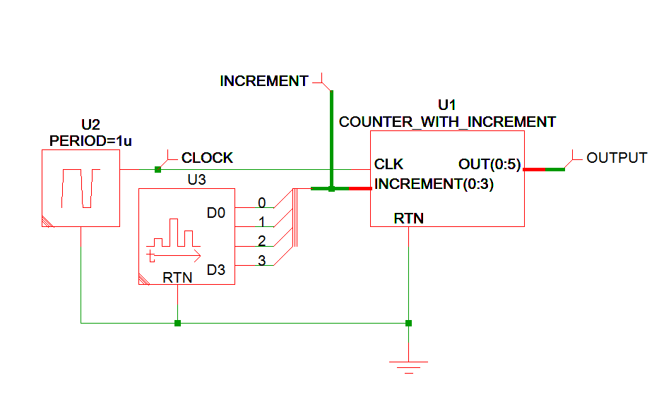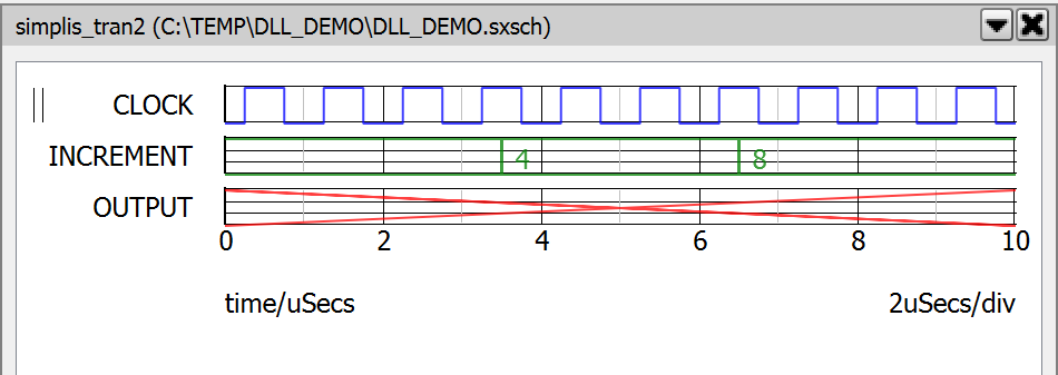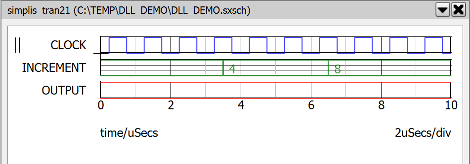 To test our device, add a digital pulse source with a PERIOD of 1u, PULSE_WIDTH of 500n and a START_DELAY of 250n. Wire up a 4 bit digital signal source to the INCREMENT bus of the DLL-defined Digital Device.