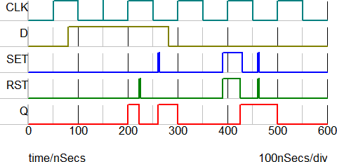 The test circuit used to generate the waveform examples in the next section can be downloaded here: simplis_014_dtypeflipflopwsetrst_example.sxsch.