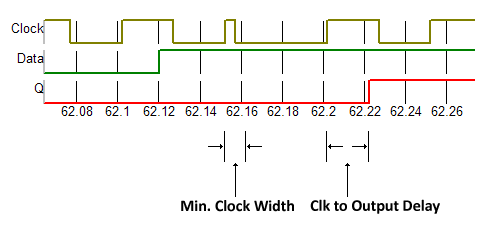 In the following example of a D-type Flip-Flop, the device is set to trigger on the positive-going edge of the clock and the clock pulse is ignored if the width of the clock pulse is narrower than the specified minimum clock width.