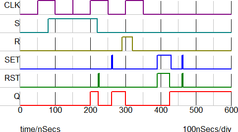 The following waveforms assume Trigger Condition=0_TO_1 which represents a rising edge clocked Flip-Flop, Set/Reset level=1, and Set/Reset Type=ASYNC, representing asynchronous set/reset.