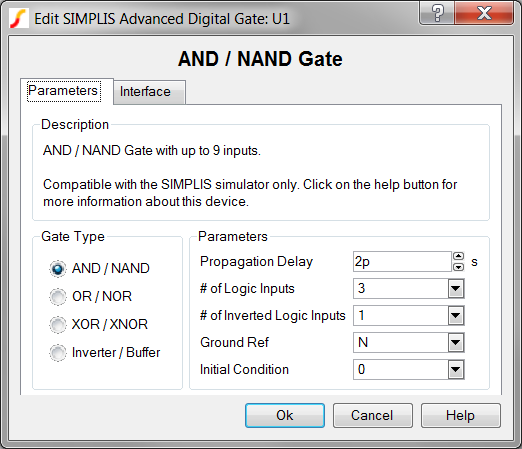 The AND/NAND Gate models a generic AND or NAND gate with up to nine inputs. The number of active-low inputs can be set to one less than the total number of inputs. Both AND and NAND outputs are provided. The outputs change state at the same time, making the outputs perfectly complementary.