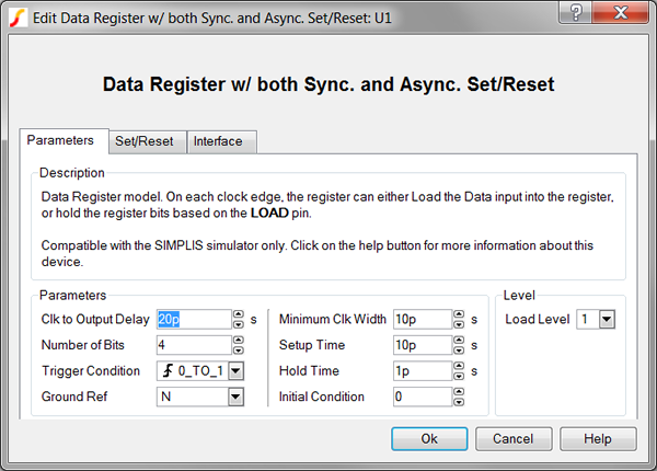 Because the Data Register with both Sync and Async Set/Reset model is generated by a template script when the simulation is executed, a hand-coded model cannot be inserted into a netlist. The template script for this device is simplis_make_register_model.sxscr, which licensed users can download as part of a zip archive of all built-in scripts.