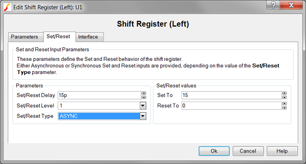The Shift Register (Left) models a combination of a clocked data type register and a shift register with left shifts only. The clock edge for the register can be set with the Trigger Condition parameter to be a rising edge (0_TO_1) or a falling edge (1_TO_0). The set/reset events can be configured to be asynchronous or synchronous to the clock with the Set/Reset Type parameter. The active logic level of the inputs can be configured with the Set/Reset Level and Load/Shift Level parameters.