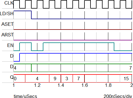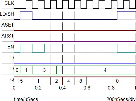 The image below shows the load and shift behavior when the D input is 0. During a Left shift operation, the D input is shifted into the LSB; since D=0, the new Q output is twice the old Q. The initial condition of the left shift register is set to 15 decimal in the example.