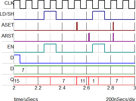 | LD/SH | ASET | ARST | EN | D | CLK | Q | |