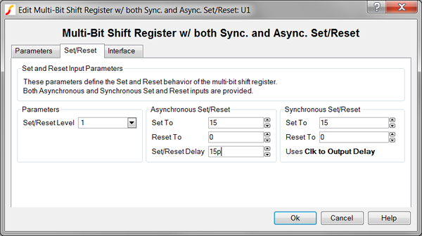 | SET_TO_SYNC | Set To | Number | none | Determines the shift register output value when the synchronous set pin goes active | ||||||||