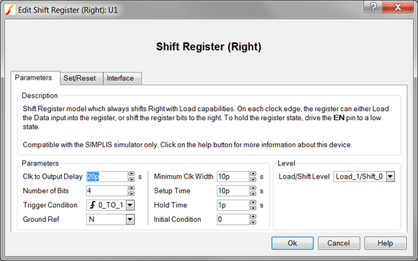 Because the Shift Register (Right) model is generated by a template script when the simulation is executed, a hand-coded model cannot be inserted into a netlist. The template script for this device is simplis_make_register_model.sxscr, which licensed users can download as part of a zip archive of all built-in scripts.
