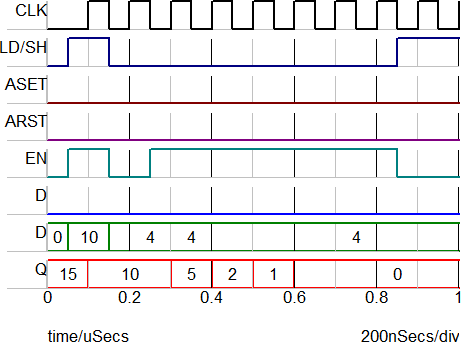 The image below shows the load and shift behavior when the D input is 0. For a right shift, the D input is shifted into the MSB; since D=0, the new Q output is half the old Q. The initial condition of the right shift register is set to 15 decimal in the example.
