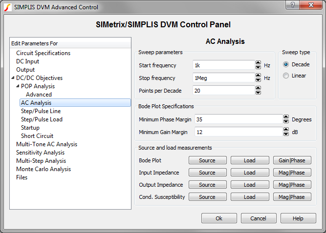 also includes specifications for the sources and loads, as well as performance