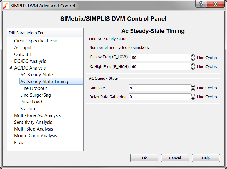 DVM sets the timing parameters for the FindAcSteadyState() test objective based on values that you enter on the Steady-State/Simulation Timing tab of the Full Power Assist DVM control symbol. The two simulation times are: