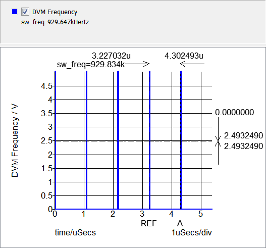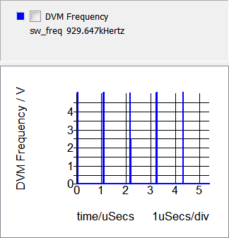 The frequency is measured over the last full switching period present in the simulation, taken from rising-edge to rising-edge of the DVM Frequency waveform. The cursors in the graph image below show the time interval over which the frequency is measured.