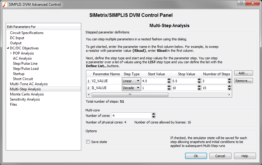 | Save state | If checked, SIMPLIS will save initial conditions files with names which reflect the stepped parameter values. You can use the GenerateInitFile entry to save the initial conditions files and the IncludeInitFile entry to include these files. |