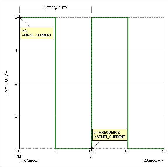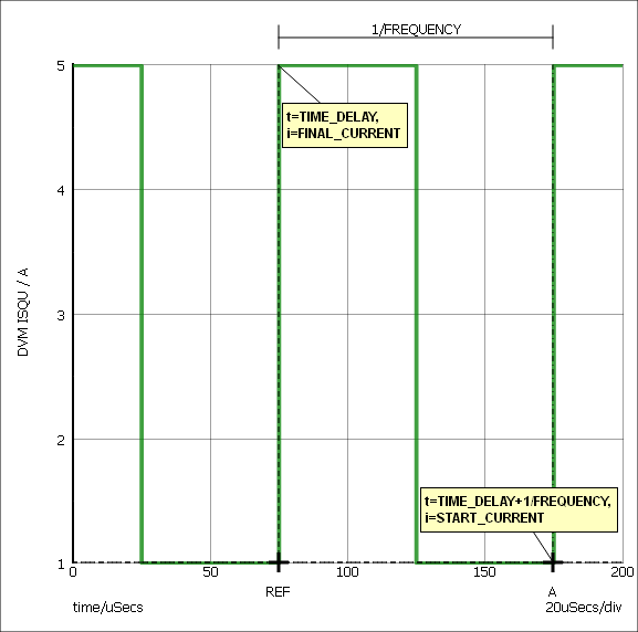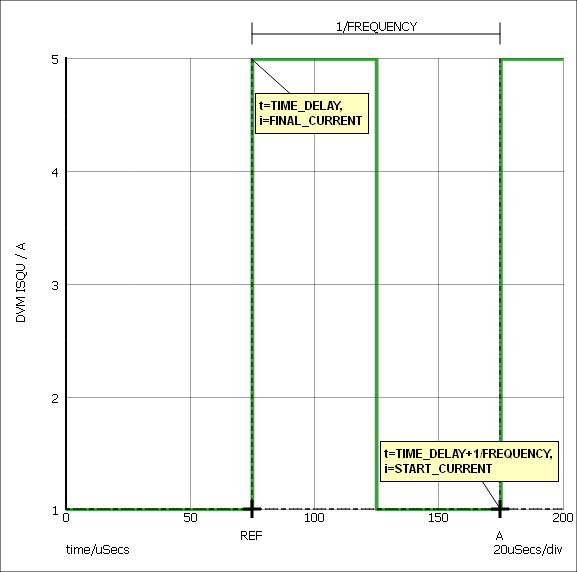 Since the TIME_DELAY parameter is set to zero, the square wave begins with the FINAL_CURRENT value of 5 at t=0.