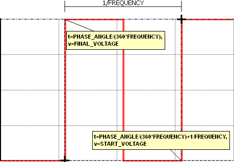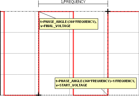 In this example the PHASE_ANGLE parameter is set to 190, and the OFF_UNTIL_DELAY is set to 1; therefore, for simulation times less than the time delay defined by the PHASE_ANGLE parameter, the source voltage is 1V, which is the value of the START_VOLTAGE argument.