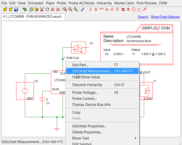- Open the schematic, 4.1_LTC3406B - DVM ADVANCED.sxsch in the LTC3406B/