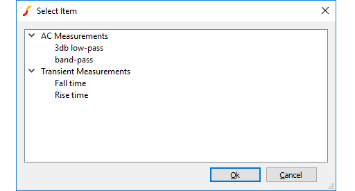 Show TreeListDialog(["'AC Measurements;3db low-pass', 'AC Measurements;band-pass', + 'Transient Measurements;Rise time', 'Transient Measurements;Fall time'"])
