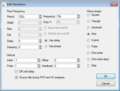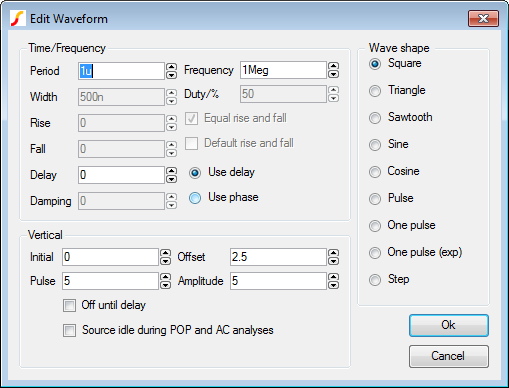 - Double click the V1 waveform generator and change these parameter values: