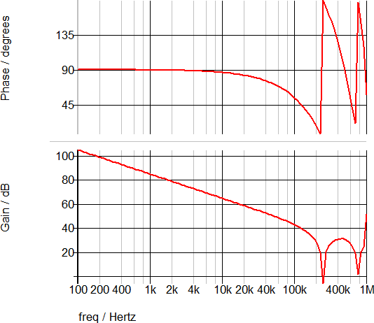The AC transfer function for the integrator is shown below.
