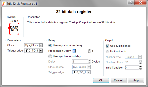 The SystemDesigner Data Register models a clocked digital register. The register can be clocked with any SystemDesigner clock. From the Output parameter box, you can limit the resulting output to either signed or unsigned numbers with fewer than 32 bits.