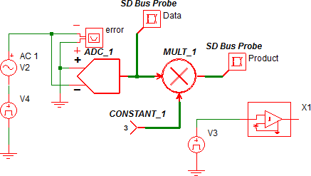In this example, the multiplier with reference MULT_1 multiplies an error signal by a constant value. The Input voltage to the ADC is a sine wave with the following parameters: