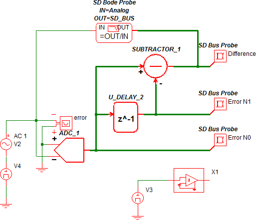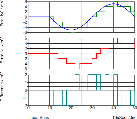 For double-precision floating-point sampled-data simulations, the ADC behaves as a sample/hold and gains the result by 1/BIN_SIZE, which, with a BIN_SIZE of 2mV is a gain of 500. The output of the ADC is therefore a sampled-time analog voltage, but without amplitude quantization. The peak amplitude of the ADC is 5.1mV * 1/BIN_SIZE or 2.55V. Notice the difference between this error and the error for the integer-data simulation. In the integer simulation, the Error N0 signal takes on discrete amplitudes, whereas in the floating point simulation, the amplitudes are not quantized. The ADC output is then input to the unit delay which then delays the analog signal one clock cycle. The subtractor then subtracts the two analog signals and produces the output: Difference = Error N1 - Error N0.