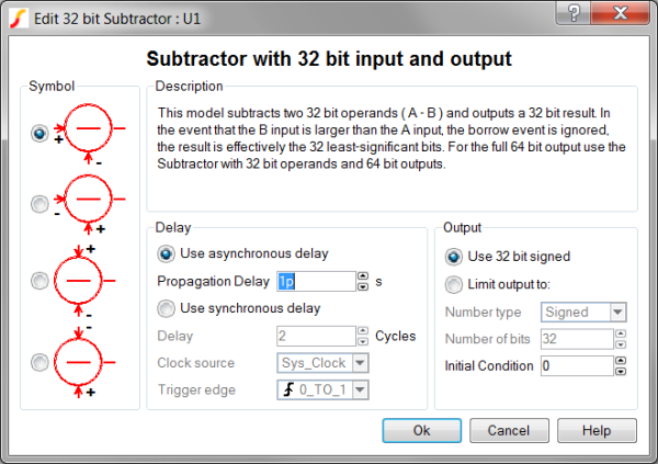 The SystemDesigner Subtractor models a subtraction operation of two SystemDesigner buses, with a 32-bit signed-integer or floating-point result. From the Output parameter box, you can limit the resulting output to either signed or unsigned numbers with fewer than 32 bits.