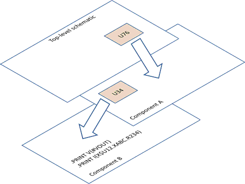 The SIMetrix vector names associated with the same two .PRINT statements in this example would then be U76.U34.#VOUT and U76.U34.U12.XABC.R234#p, respectively.