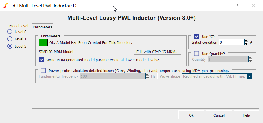 You will notice in the above schematic that inductor L2 has been marked for MDM post-processing and therefore contains a Level 2 model. Double click the symbol L2.
