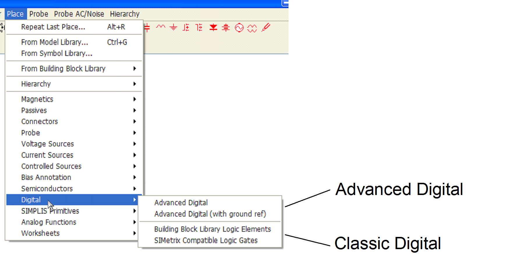 We refer to the new digital components as "Advanced Digital components" while referring to the traditional digital models in SIMPLIS as the "classic digital components." Beginning with SIMPLIS v5.6 , both classic and Advanced Digital components are supported and they are both available for placement on the schematic through a reorganized set of menus in the schematic editor.