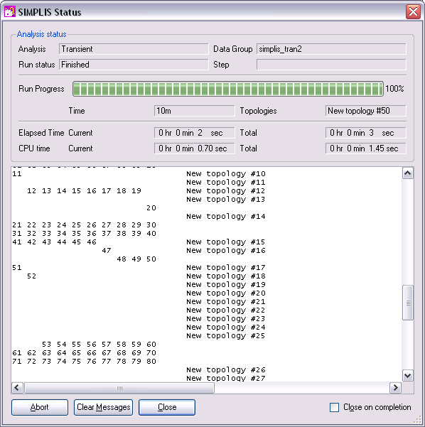 This progress is displayed in the SIMPLIS Status Window as shown below.