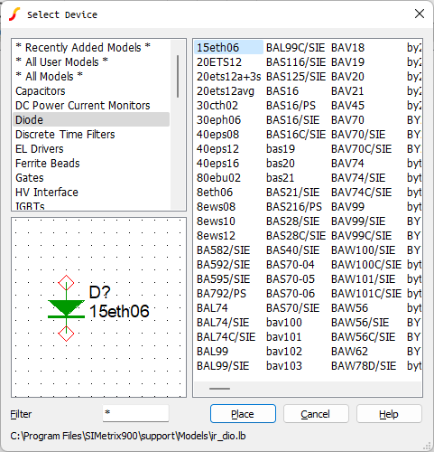 - Select D1n4148 in the top right pane, and then click the Place