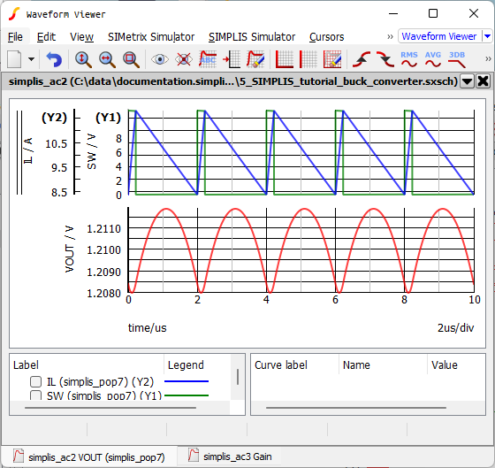 In the graph output from 3.3 Set up an AC Analysis, you had two tabs: simplis_pop1 VOUT (Y1) and simplis_ac1, these are the data groups created by SIMPLIS.