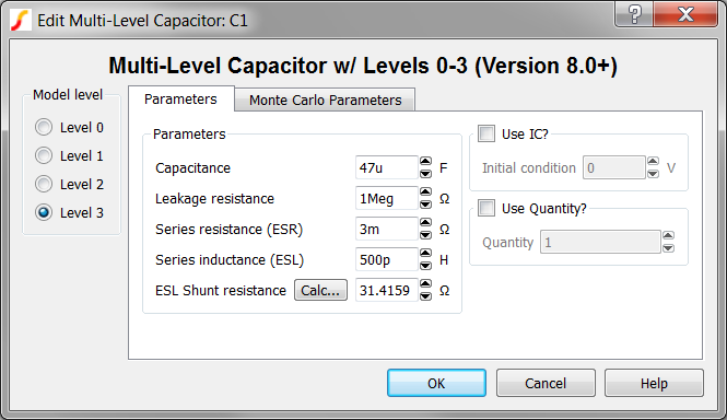 The Multi-Level Capacitor has four model levels. As the level increases, additional parasitic circuit elements are added. This capacitor, available with Version 8.0 or later, is used to model a wide variety of capacitor types where the number and type of parasitic circuit elements can be configured.