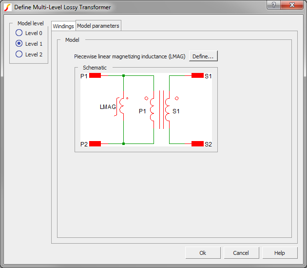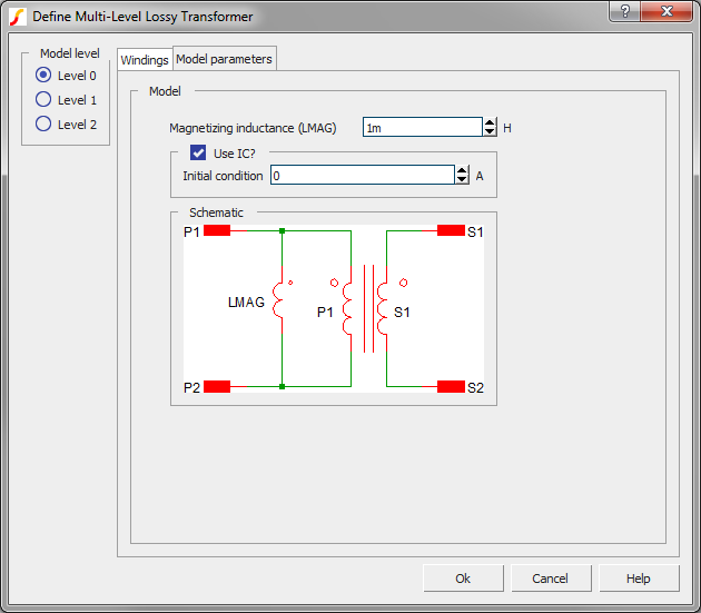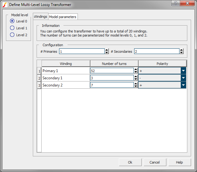 The parameters on the windings tab define the number of primary and secondary windings, the number of turns for each winding, and the "dot" polarity of each winding. You can edit the winding names on this tab, and the winding names will be copied to the Parameters tab on the dialog. For model levels 0-2, the number of turns on the dialog can be parametrized. For the level 3 model, the number of turns must be an integer value - no parameterization is allowed. The transformer symbol is re-drawn after you accept the dialog using the number of primary and secondary windings. For this reason, the number of primary and number of secondary windings cannot be parametrized.
