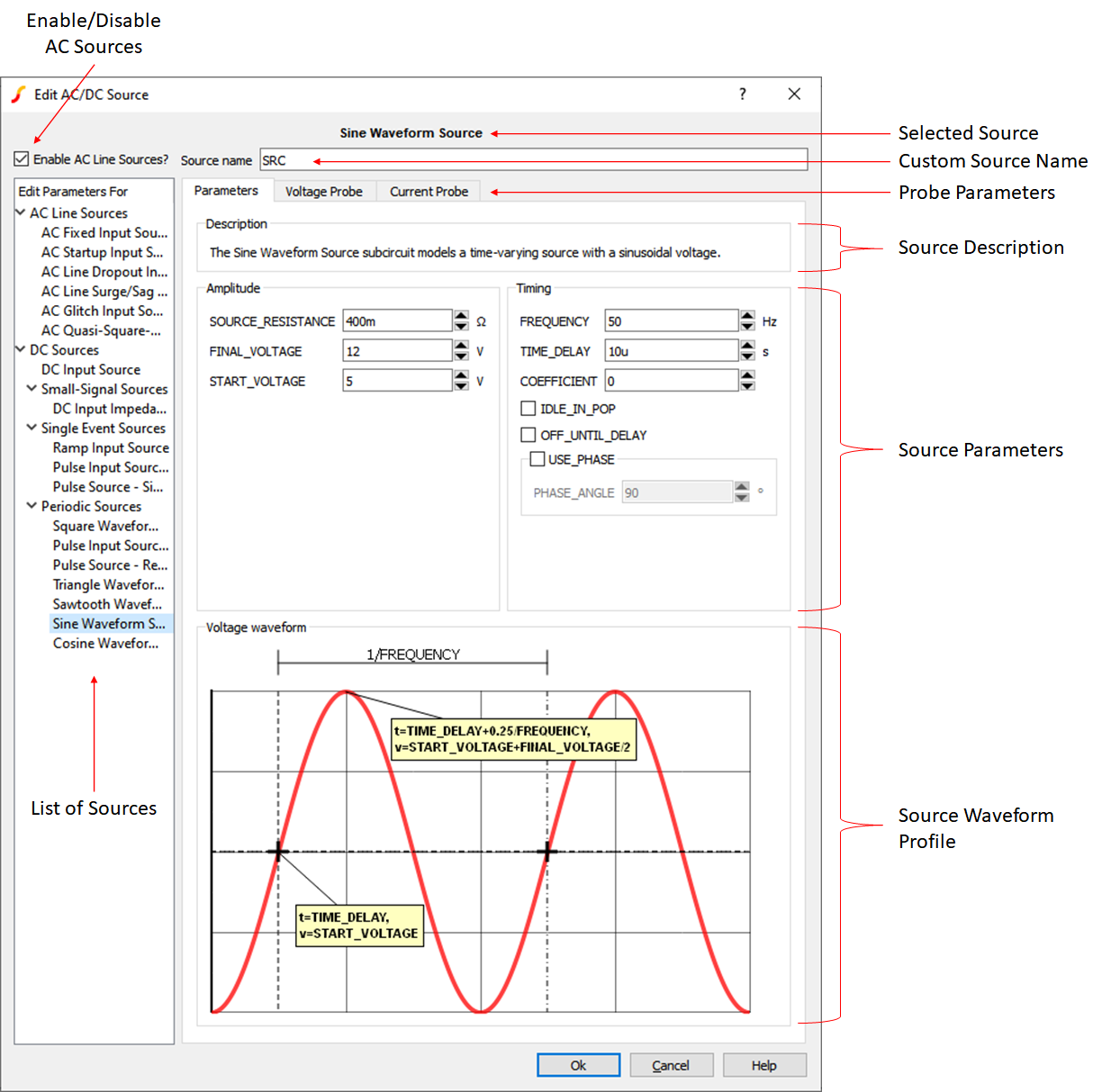 Each Power Supply Source listed below has internal voltage and current probes. Small-Signal Sources also have additional AC probes. All probes are fully customizable and can be enabled or disabled.