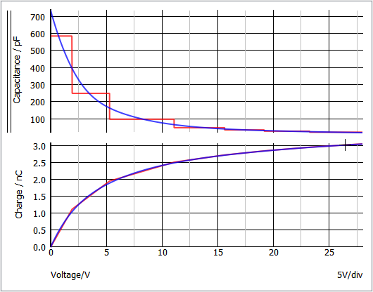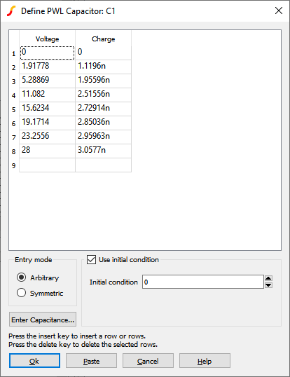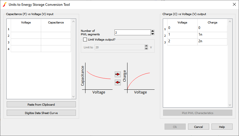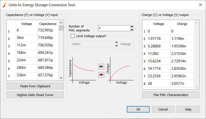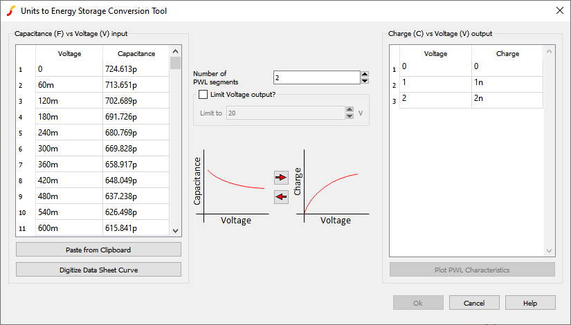 Introduced in version 8.4, a tool has been added that will allow the user to enter the capacitance (in Farads) vs voltage characteristics and convert to a charge (in Couloms) vs voltage PWL capacitor. With Pro and Elite licenses, the Digitise Datasheet Curves tool is encorporated to import the capacitance vs voltage characteristics.