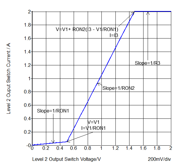 The Level 0 model uses simple switches with on resistance RON1. The output characteristics of one of these switches is shown below with a schematic diagram of the switch configuration.