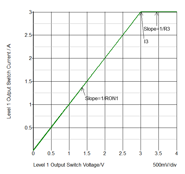 The Level 1 model uses transistor switches which model both on resistance RON1, and peak current I3. When the switch is sourcing/sinking the peak current, a parallel output resistance R3 is present across the switch terminals. The output characteristics of one of these switches is shown below with a schematic diagram of the switch configuration.