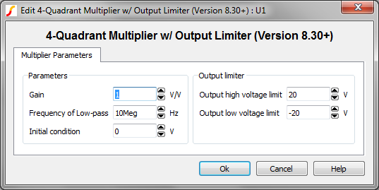 A four quadrant multiplier with limiter example schematic can be downloaded here: simplis_084_4_quad_w_limiter.sxsch. In this example, the amplitude and phase between the two sinusoidal waveform sources is defined in the F11 window with a variable statement. Two multipliers are used to multiply the sinusoidal waveforms - the upper multiplier (U1) output is dominated by the two external sources, VLIM_HIGH and VLIM_LOW. The output of the lower multiplier (U2) is only dependent on the parameter values entered into the multiplier's editing dialog.